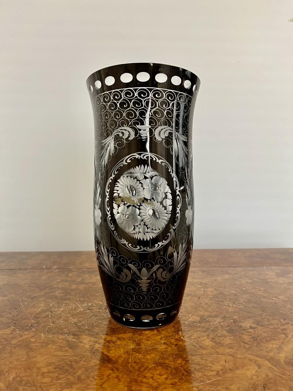 For sale is this fine quality mid 19th Century Victorian antique cut glass vase decorated with flowers, leaves and swags
