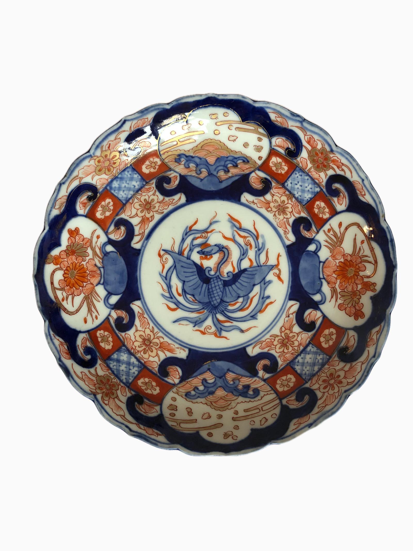 Fine Quality Pair Of Antique Japanese Imari Plates having a scalloped shaped edge with fantastic hand painted panels with vases of flowers, leaves, trees & birds in wonderful red, blue & white colours.