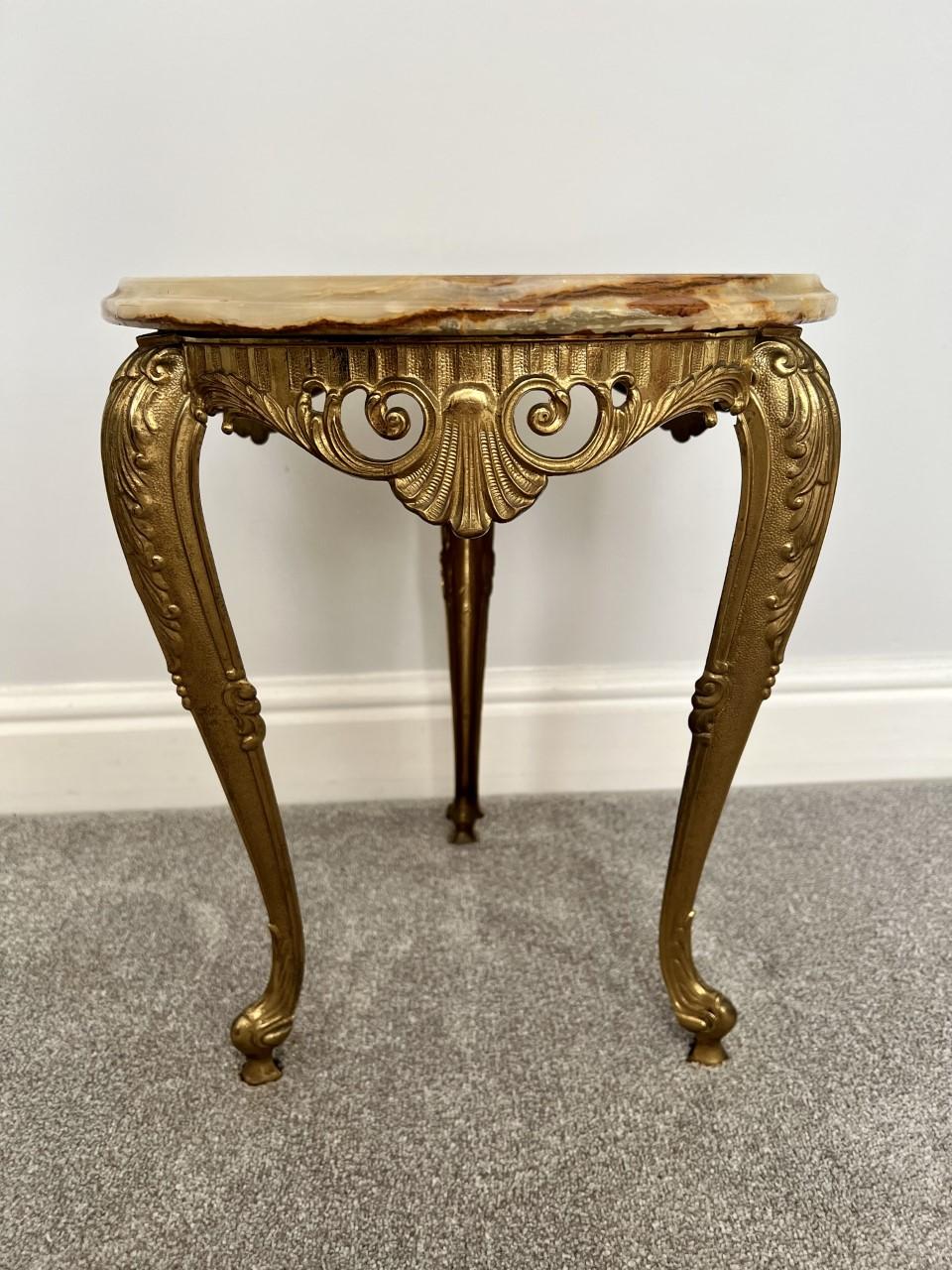 French onyx and gilt metal lamp table having a quality circular onyx removable top with a thumb moulded edge above an ornate gilded metal base standing on shaped cabriole legs with scroll feet