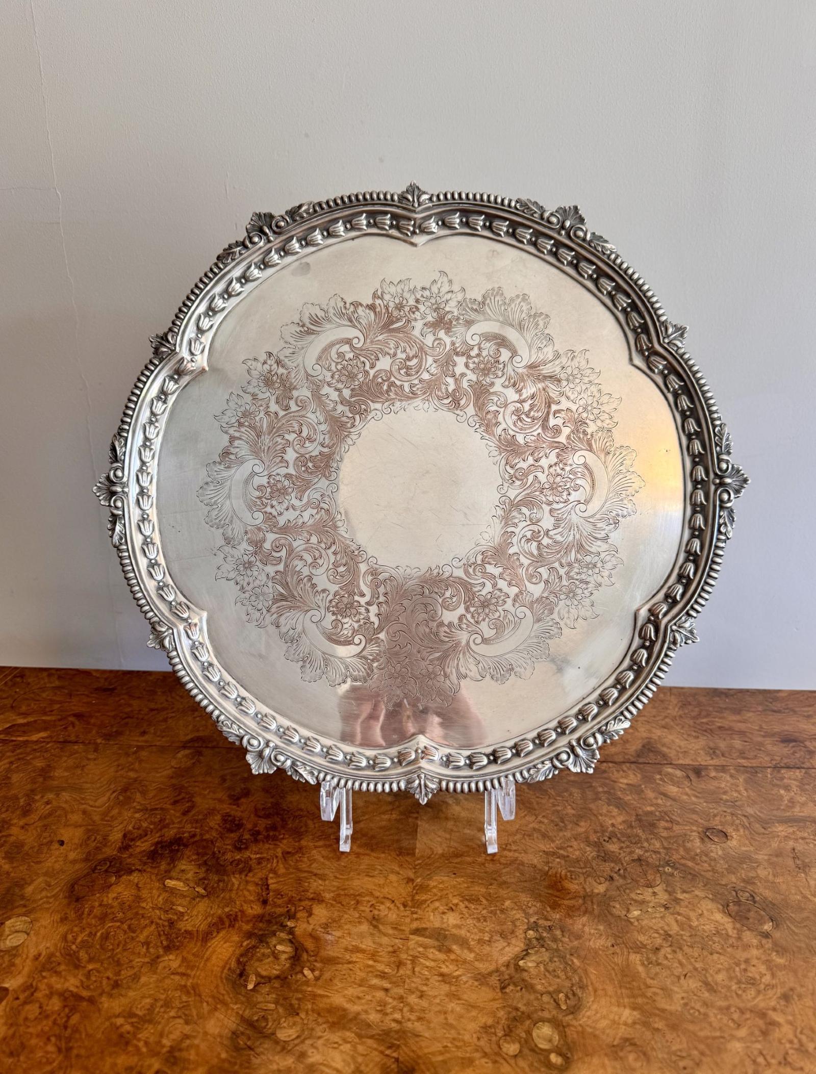 Impressive large quality antique Victorian silver plated tray, having a large circular shaped silver plated tray with beautiful engraved decoration to the tray surrounded by a decorative ornate embossed border, raised on three claw ball feet.