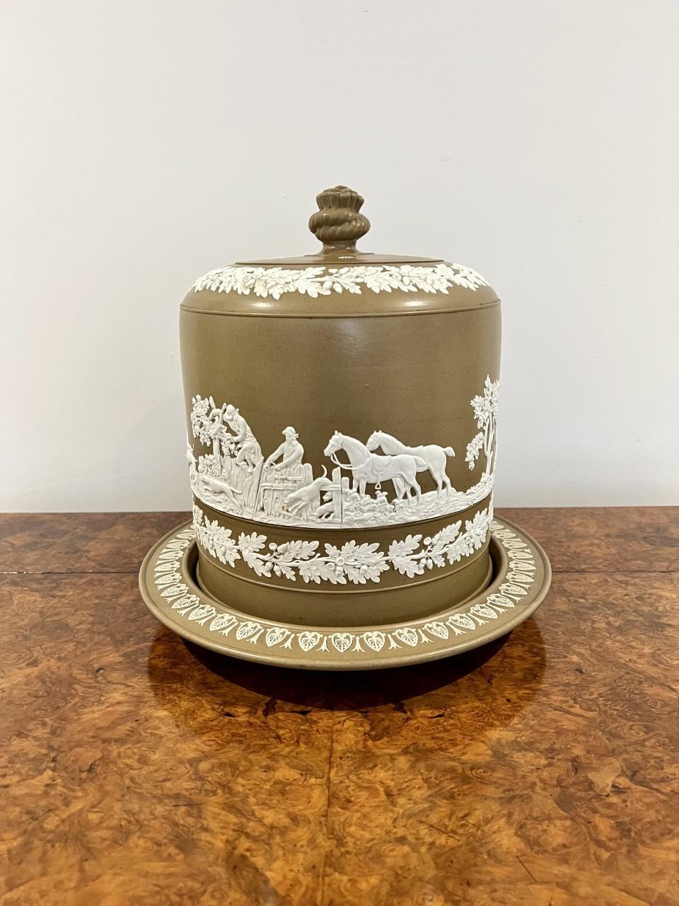 Large antique Edwardian quality cheese dish having a large quality antique cheese dish on the original circular stand with wonderful white enamel decoration with horses, dogs, figures, scenery and leaves on a brown background.