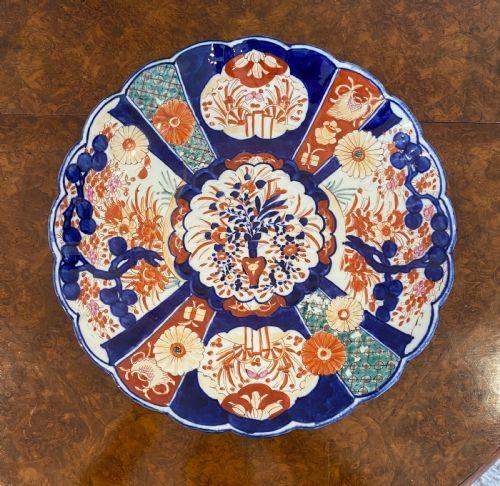 Large antique Japanese quality Imari charger, having a quality scroll shaped edge with hand painted panels with flowers, leaves and trees in wonderful green, red, blue and white colours.