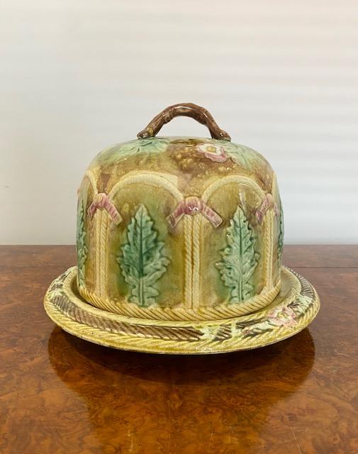 Large antique quality Majolica cheese dish having a large quality dome shaped lift off top with a shaped handle decorated with flowers, leaves and ribbons in wonderful green, pink, brown and yellow colours on a circular base