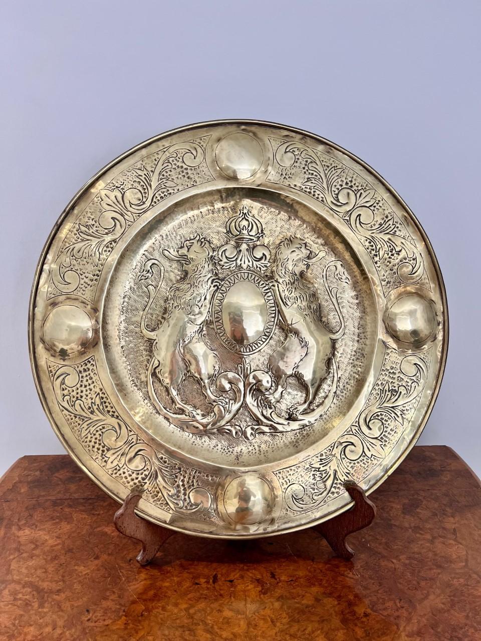 This is a large mid 19th Century Victorian antique quality brass alms dish having quality embossed decoration with a coat of arms to the centre.