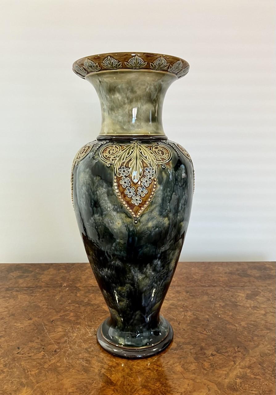 Large antique Victorian quality Royal Doulton vase having a large shaped antique Victorian Doulton vase with art nouveau decoration in wonderful blue, green and brown colours. Marked on the base