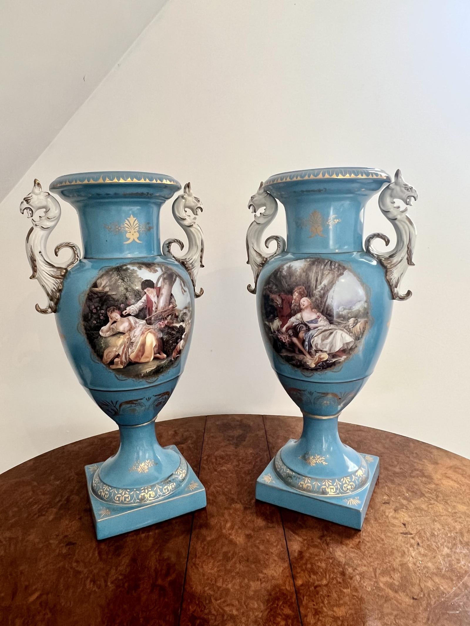Large pair of late 19th Century Continental quality porcelain vases with unusual handles to the sides, wonderful blue, white and gold colours with hand painted panels depicting romantic scenes, raised on square pedestal bases.