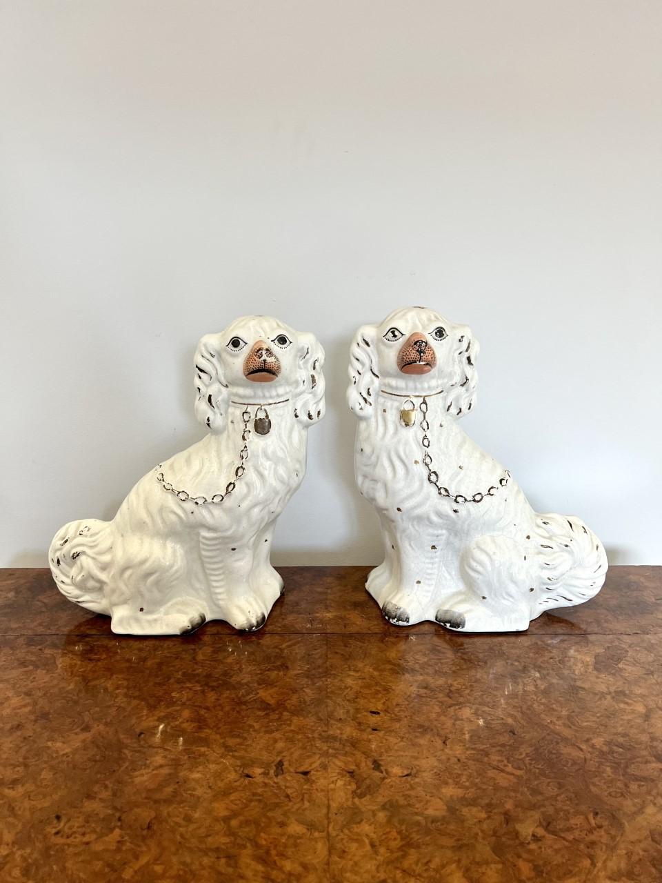 Large pair of Victorian seated Staffordshire spaniel dogs, having a large pair of antique Victorian seated spaniel dogs with matching white coats with gold detail with gold collars and padlocks.