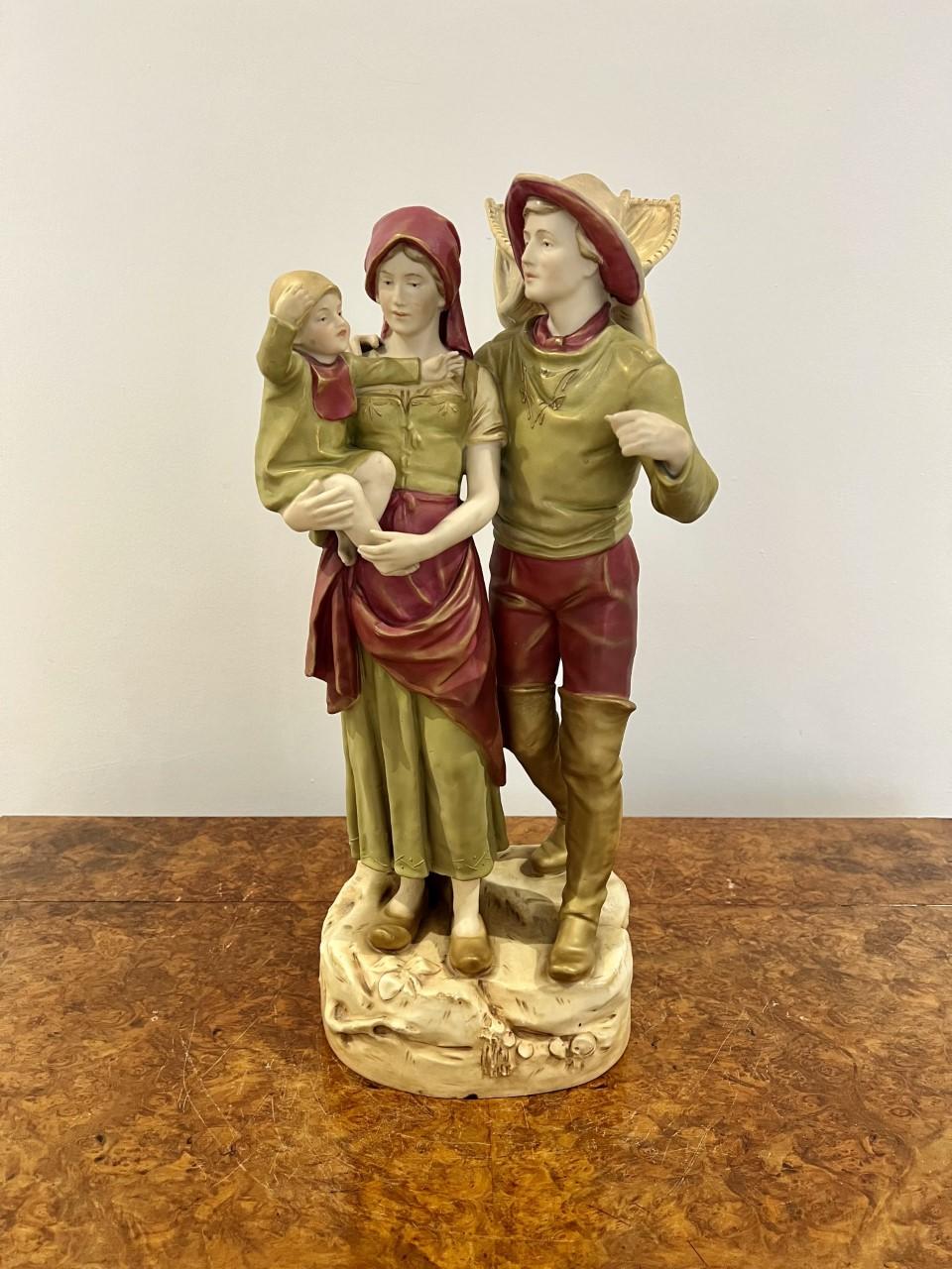 This is a large Royal Dux figural group of a couple standing with their child in the mothers arms on a naturalistic base in wonderful green, yellow, gold and red colours. Signed Hampel