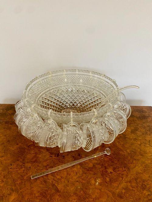 This is a large unusual Edwardian antique quality glass punch bowl with eighteen original cups and glass ladle raised on a circular base.