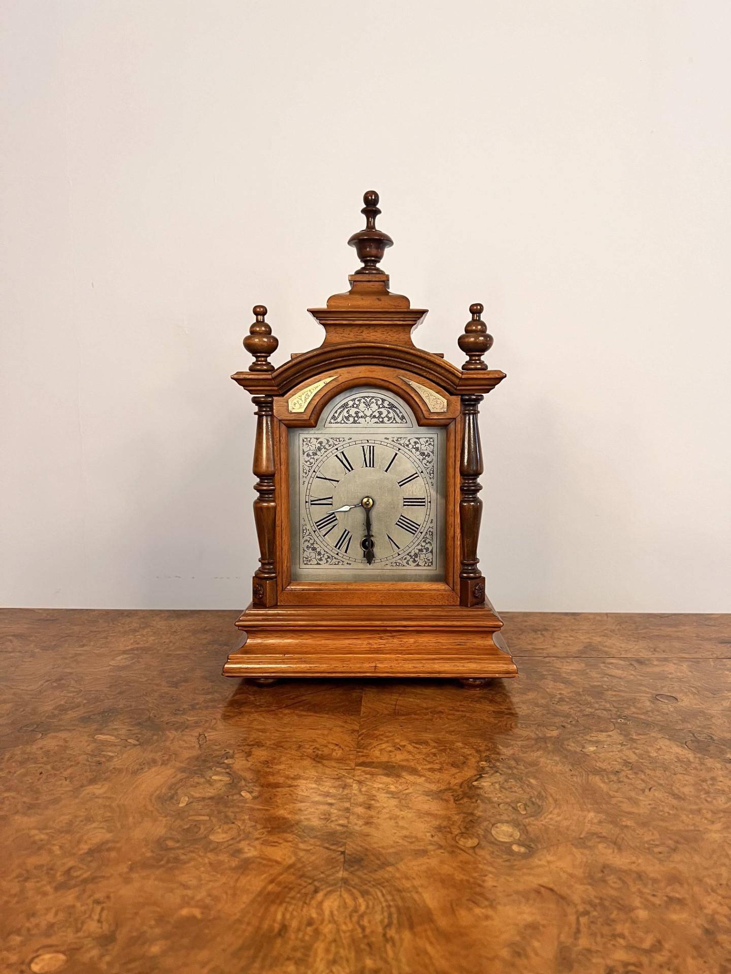Lovely antique German Black Forest mantle clock, having a quality walnut case with turned columns shaped top with the original finales, standing on a stepped base, silvered arched engraved dial with Roman numerals and the original hands having an eight day movement.