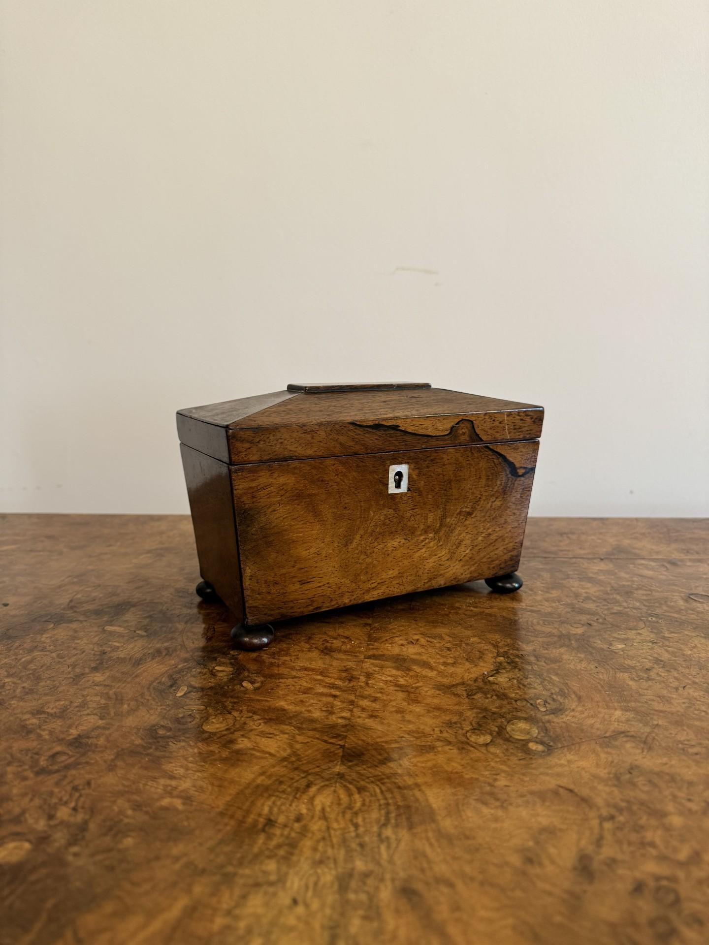 This is a lovely late 19th Century Victorian antique rosewood tea caddy, having a quality rosewood tea caddy with a lift up lid opening to reveal two compartments with removable lids for tea, raised on the original bun feet.