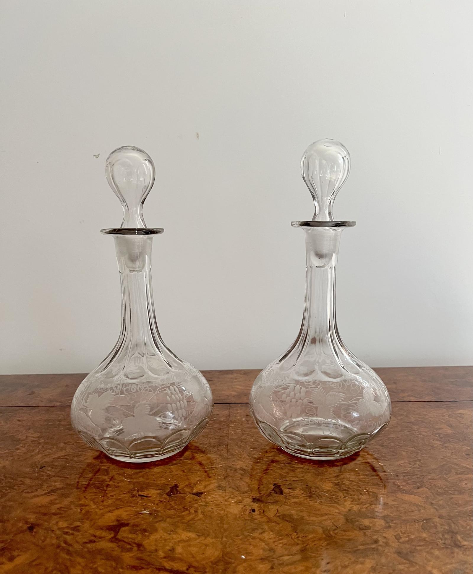 These are a lovely pair of late 19th Century Victorian antique decanters with a round shaped body with stunning grape and vine decoration having the original stoppers.