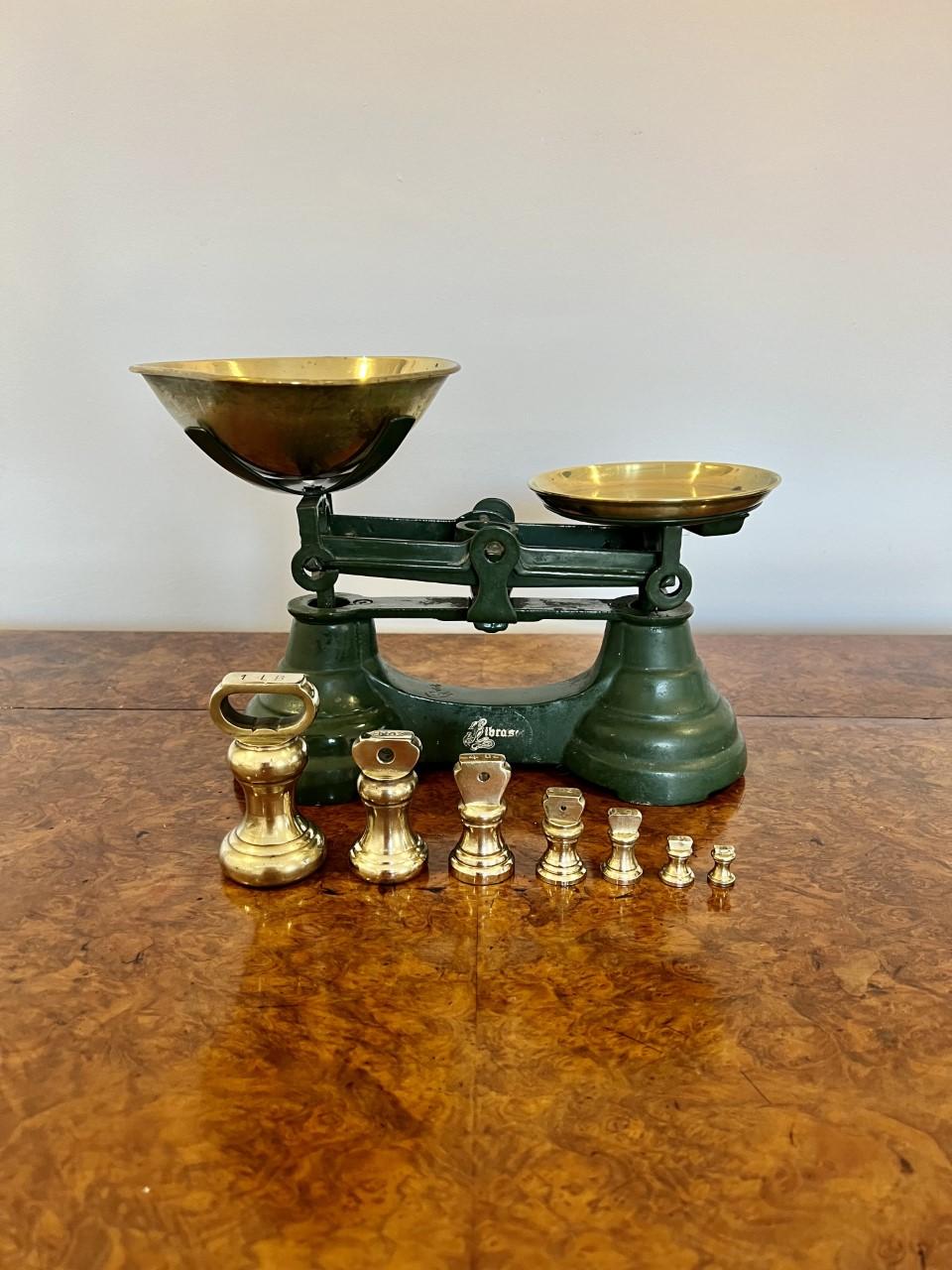 Lovely Set of Green Antique Kitchen Scales with Set of Brass Bell Weights