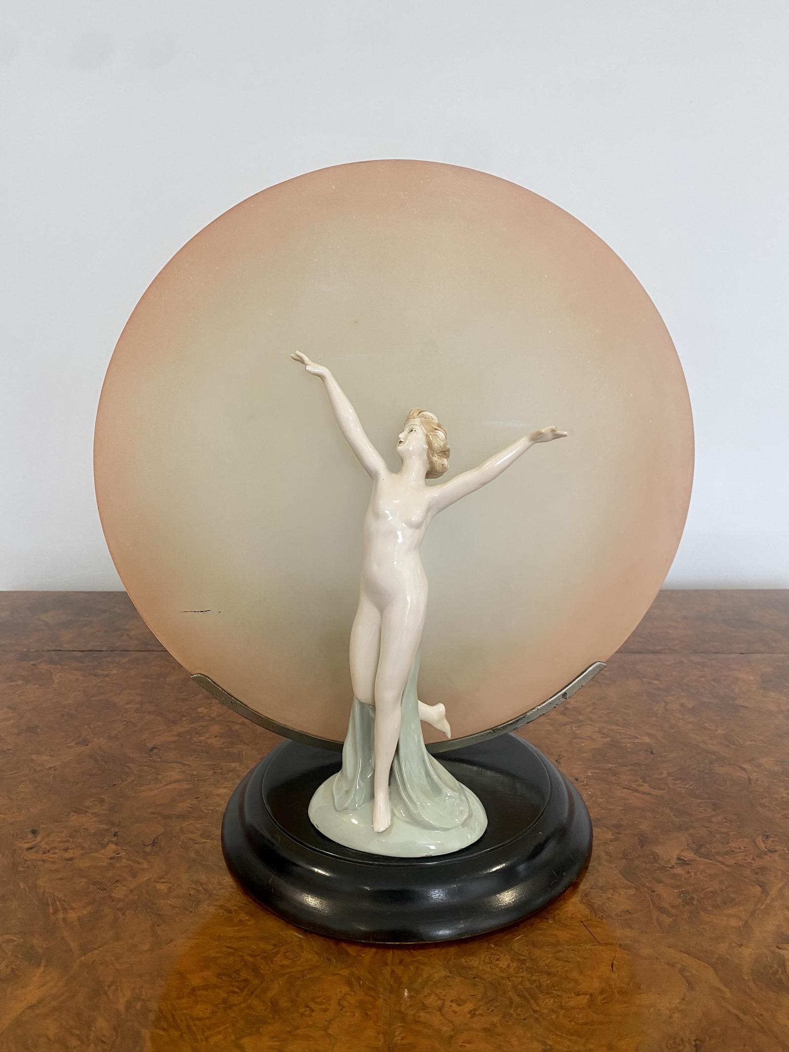Original Art Deco quality lamp having a quality Art Deco dancing lady with the original circular shaped glass background.