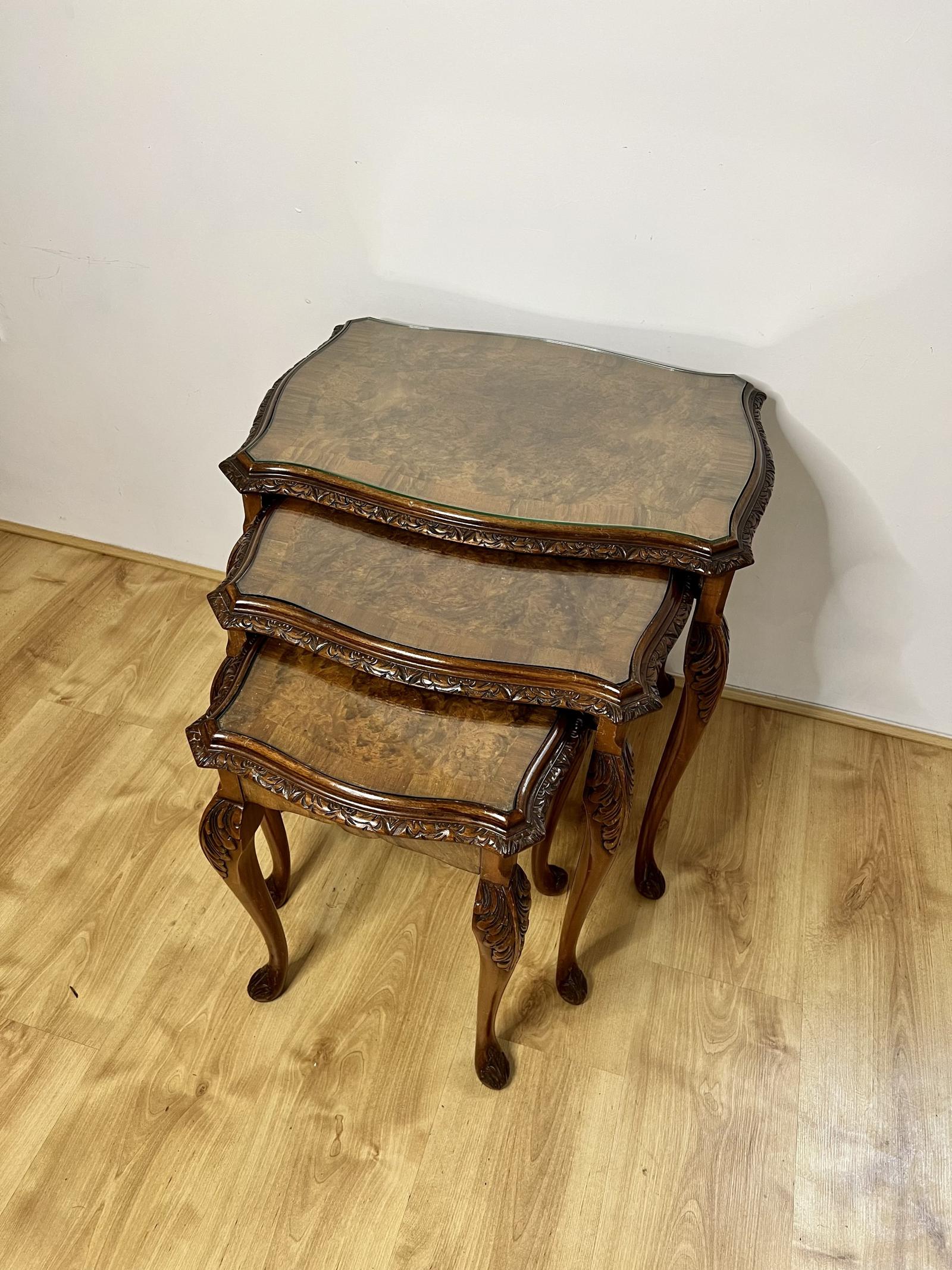 Outstanding quality antique burr walnut nest of three tables with serpentine shaped tops with a carved edge, standing on carved solid walnut shaped cabriole legs with carved scroll feet. Beautifully crafted and designed displaying fantastic colour, the three tables have glass removable tops.