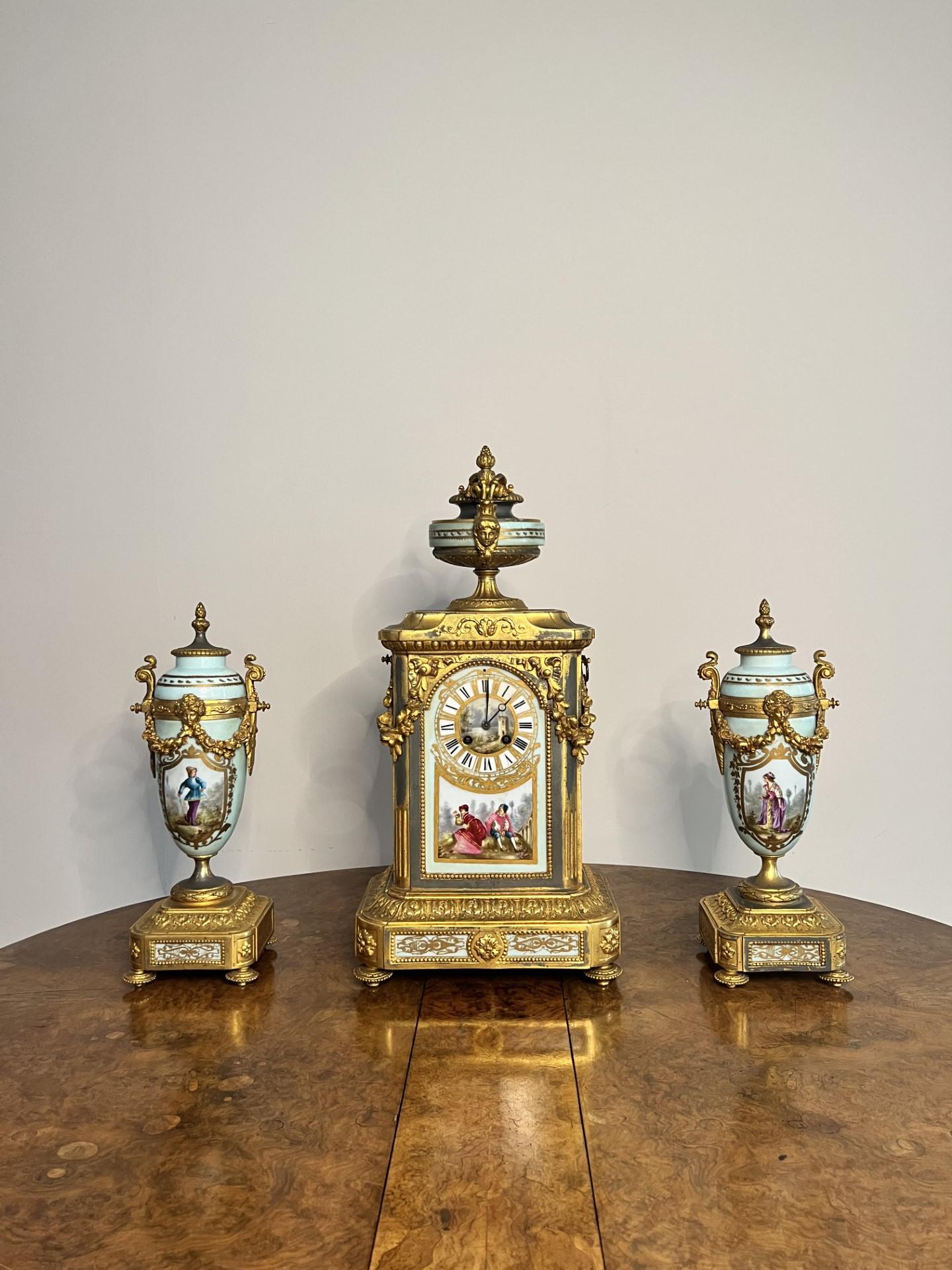 Outstanding quality antique French mantle clock garniture set having a quality 19th century antique French clock garniture set, with fantastic ornate gilt metal mounts with stunning hand painted porcelain panels decorated with figural and landscape scenes surrounded by gold gilded borders on a blue ground, hand painted in stunning green, pink, blue, brown and purple colours, having a porcelain dial with a hand painted landscape surrounded by Roman numerals with the original hands, having a French eight day movement, standing on shaped ornate feet.