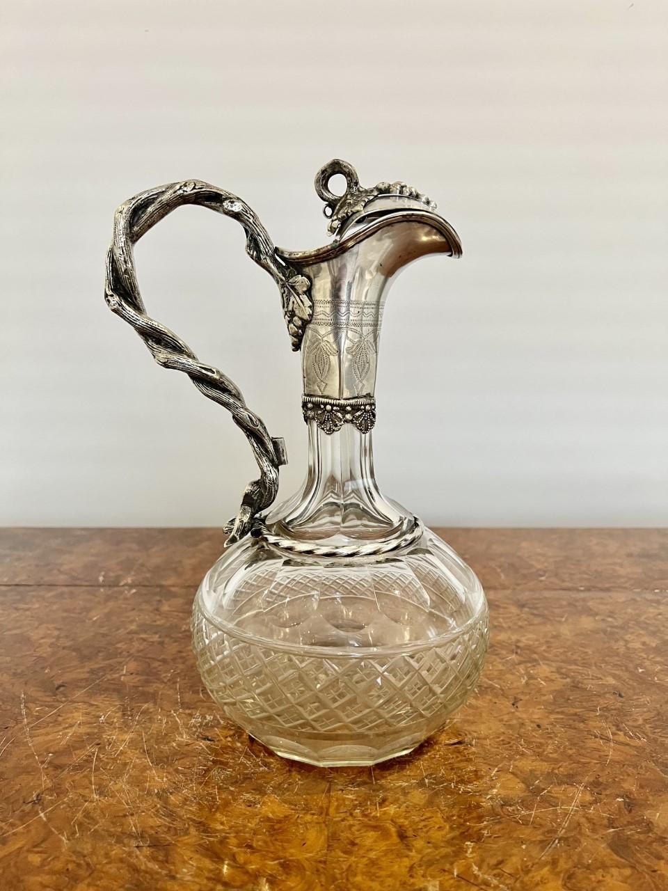 Outstanding quality mid 19th Century Victorian antique cut glass and silver plated claret jug having an outstanding quality cut glass claret jug with an ornate silver plated top and shaped handle.