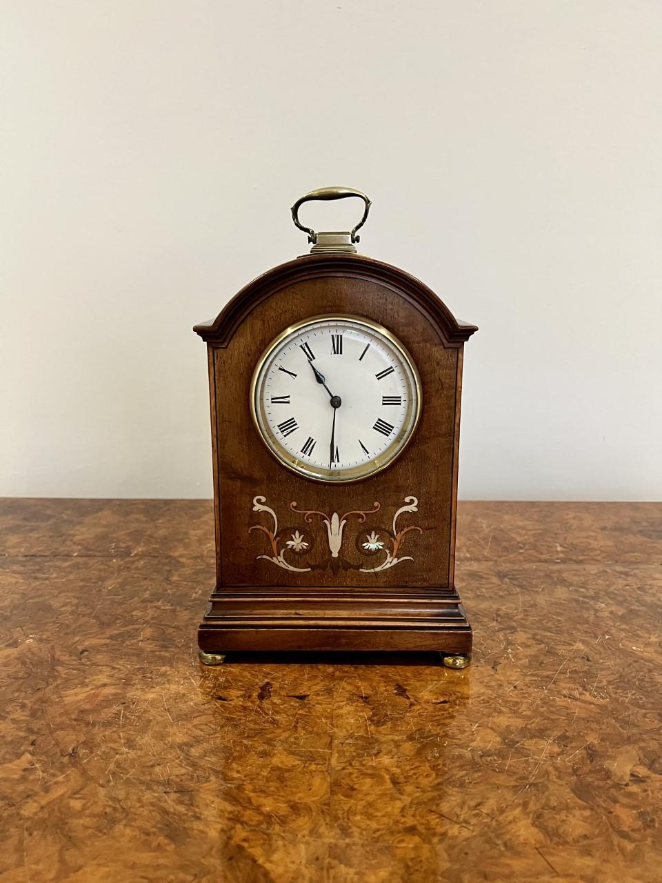Outstanding quality antique Victorian mahogany inlaid mantle clock having an outstanding quality mahogany inlaid case with a brass carrying handle to the arched top having a brass bezel circular porcelain dial with Roman numerals and an 8 day movement with the original hands.