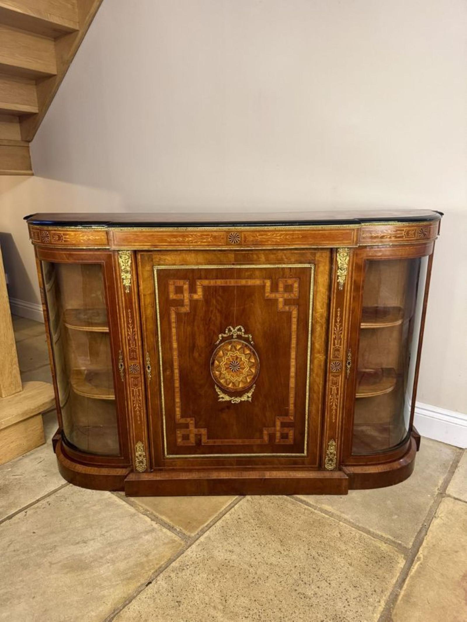 Outstanding quality antique Victorian walnut inlaid credenza, having a quality richly polished walnut inlaid antique Victorian breakfront credenza, with a quality walnut moulded shaped top with an ebonised moulded shaped edge above a central door decorated with intricate marquetry detail featuring a circular patterned motif framed by geometric inlay and ormolu mounts, opening to reveal a red velvet interior with one shelf, flanked by a pair of bow fronted glazed doors with two shelves, raised on a walnut plinth shaped base.