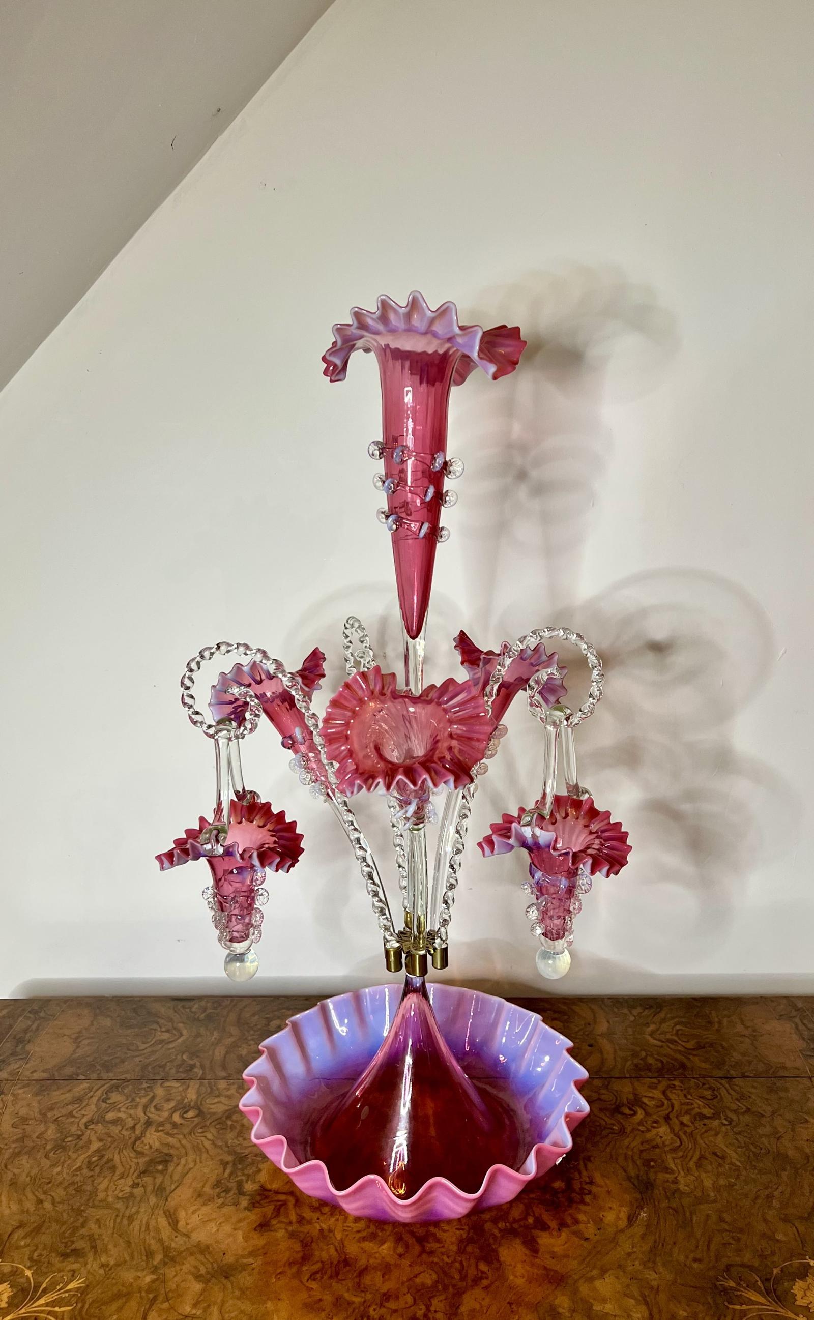 Outstanding quality large antique Victorian cranberry glass epergne having one tall trumpet to the centre, three smaller trumpet shaped flower holders and two hanging baskets on transparent shaped canes standing on a circular shaped wavy edge dish.