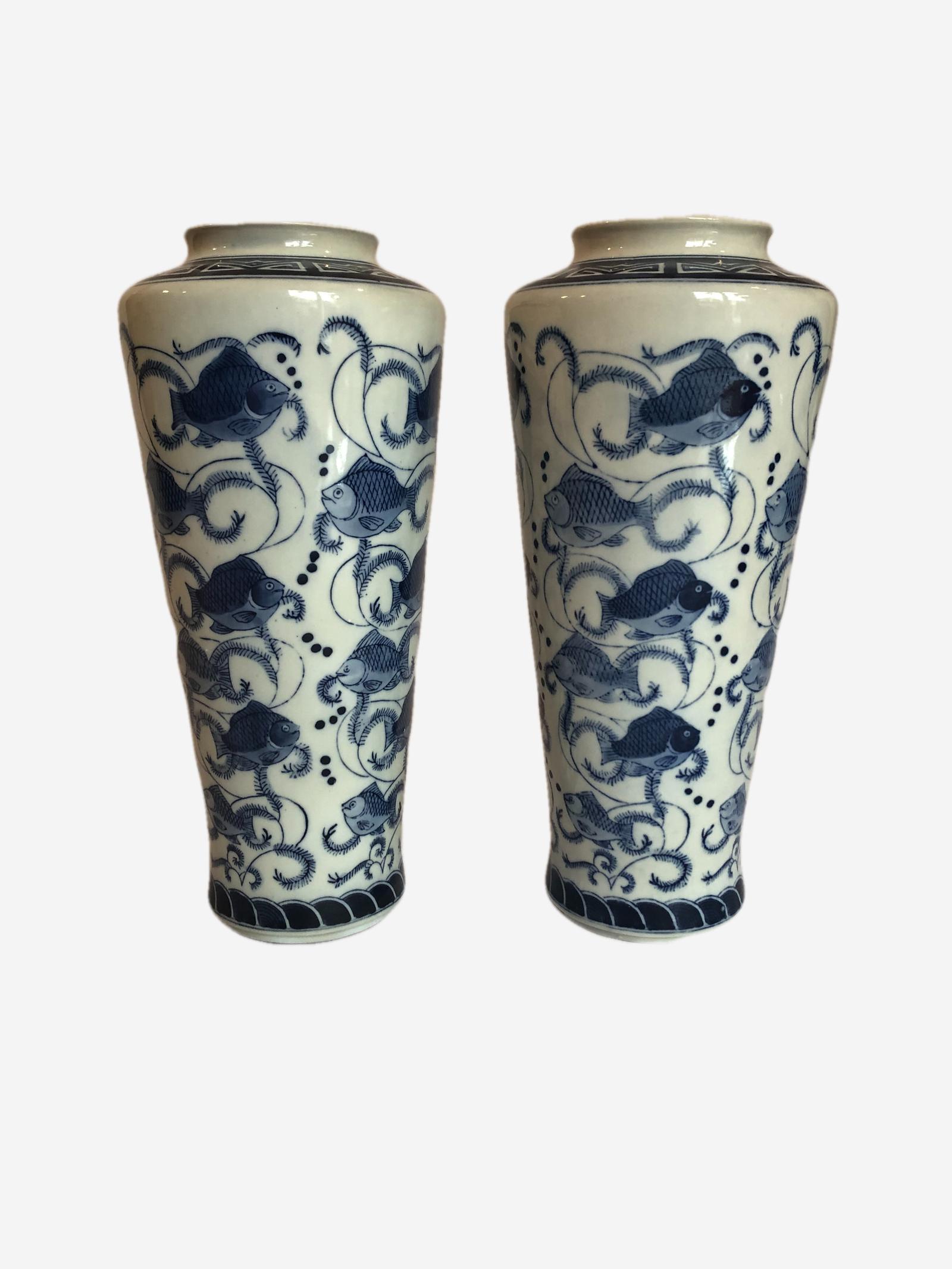 Pair of antique Chinese blue & white vases having quality hand painted carp in wonderful blue & white colours.