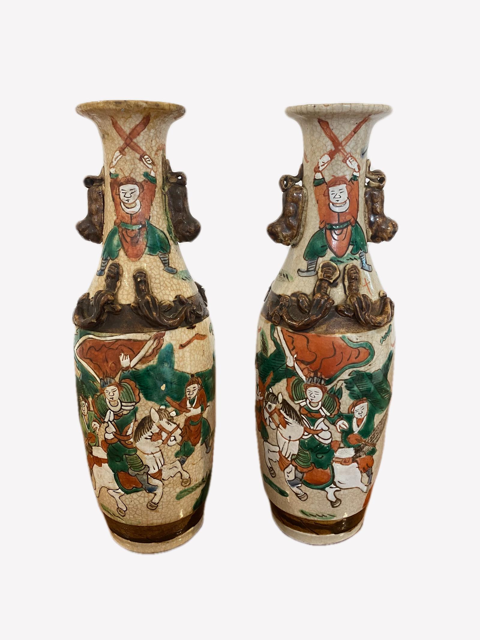 Pair of antique Chinese porcelain vases, having a shaped top with lovely hand painted Chinese vases in green, red, white, brown and gold colours.