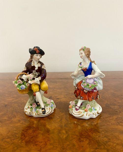 Pair of antique Continental porcelain figures holding a basket of flowers and a hat in wonderful green, red, blue, yellow and white colours.