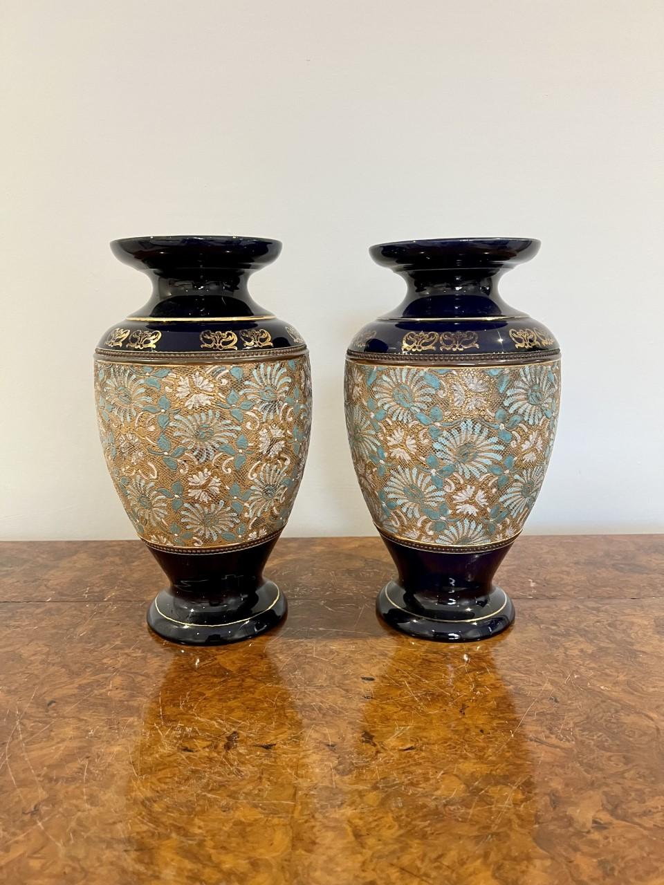Pair of antique Doulton Lambeth vases, lovely shaped pair of Doulton vases in blue, white and gold colours with floral decoration.