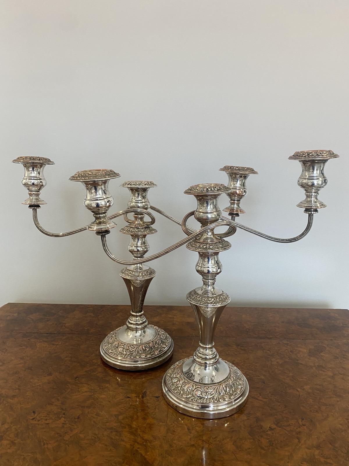 Pair of antique Edwardian quality ornate silver plated candelabras having quality ornate three light branches above an ornate column standing on ornate circular bases