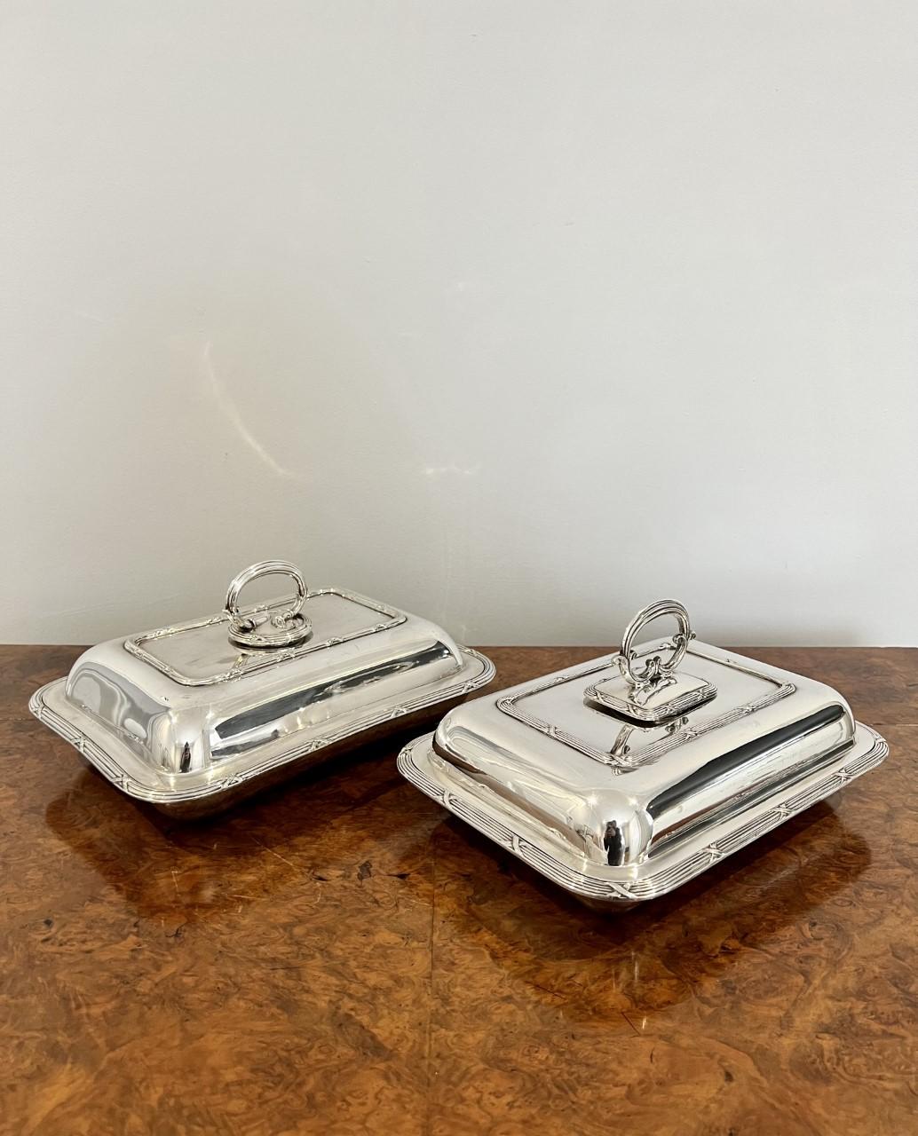 Pair of antique Edwardian silver plated entree dishes having a quality pair of silver plated rectangular entree dishes with removable lids, ornate detail and ornate handles.