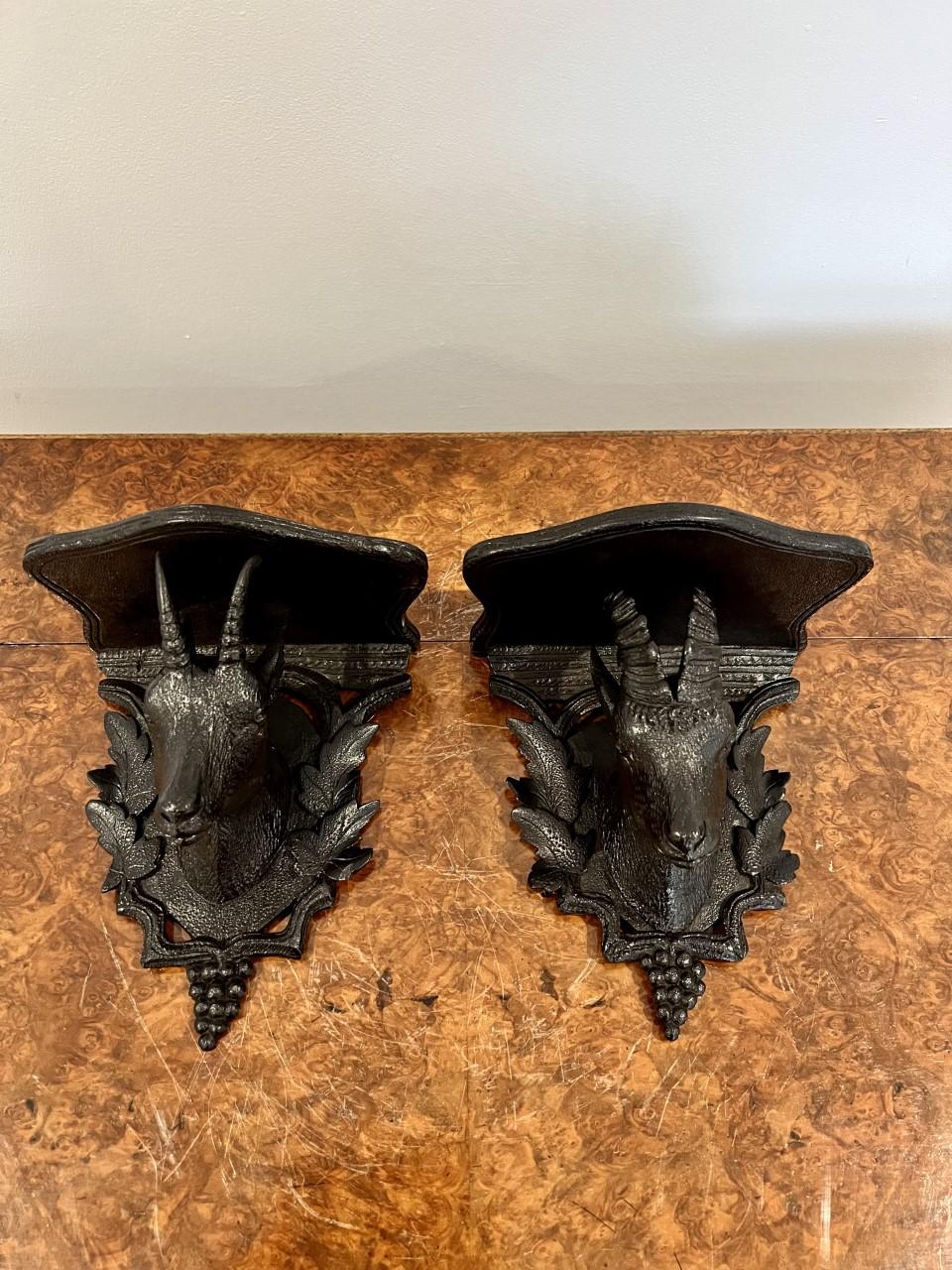 Pair of antique quality Black Forest carved wall brackets having a male and female carved goats with a shaped carved back and top.