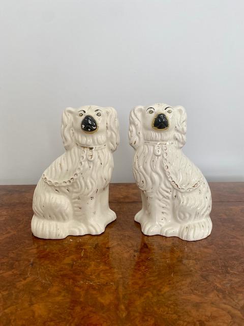 Pair of late 19th Century Victorian antique Staffordshire Dogs, having a pair of seated spaniels in white and gold coloured coats with matching collars and padlocks.