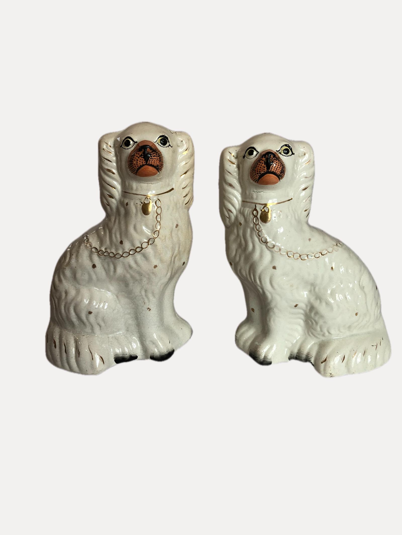 Pair of antique Victorian Staffordshire dogs. Having matching White and Gold coloured coats, collars, chains and padlocks.