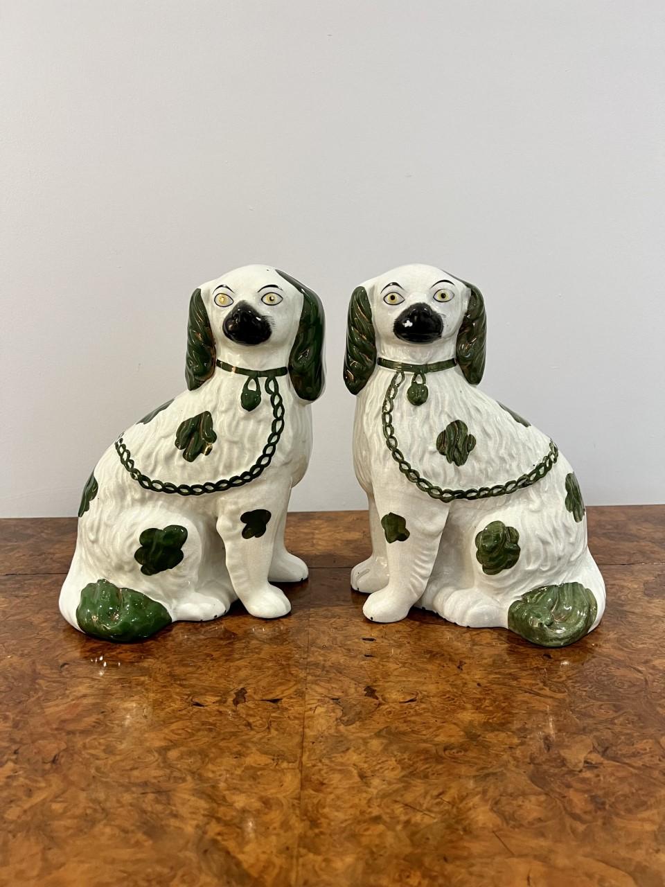 Pair of late 19th Century Victorian antique Staffordshire dogs, both seated in matching green & white coats, collars, padlocks and chains.