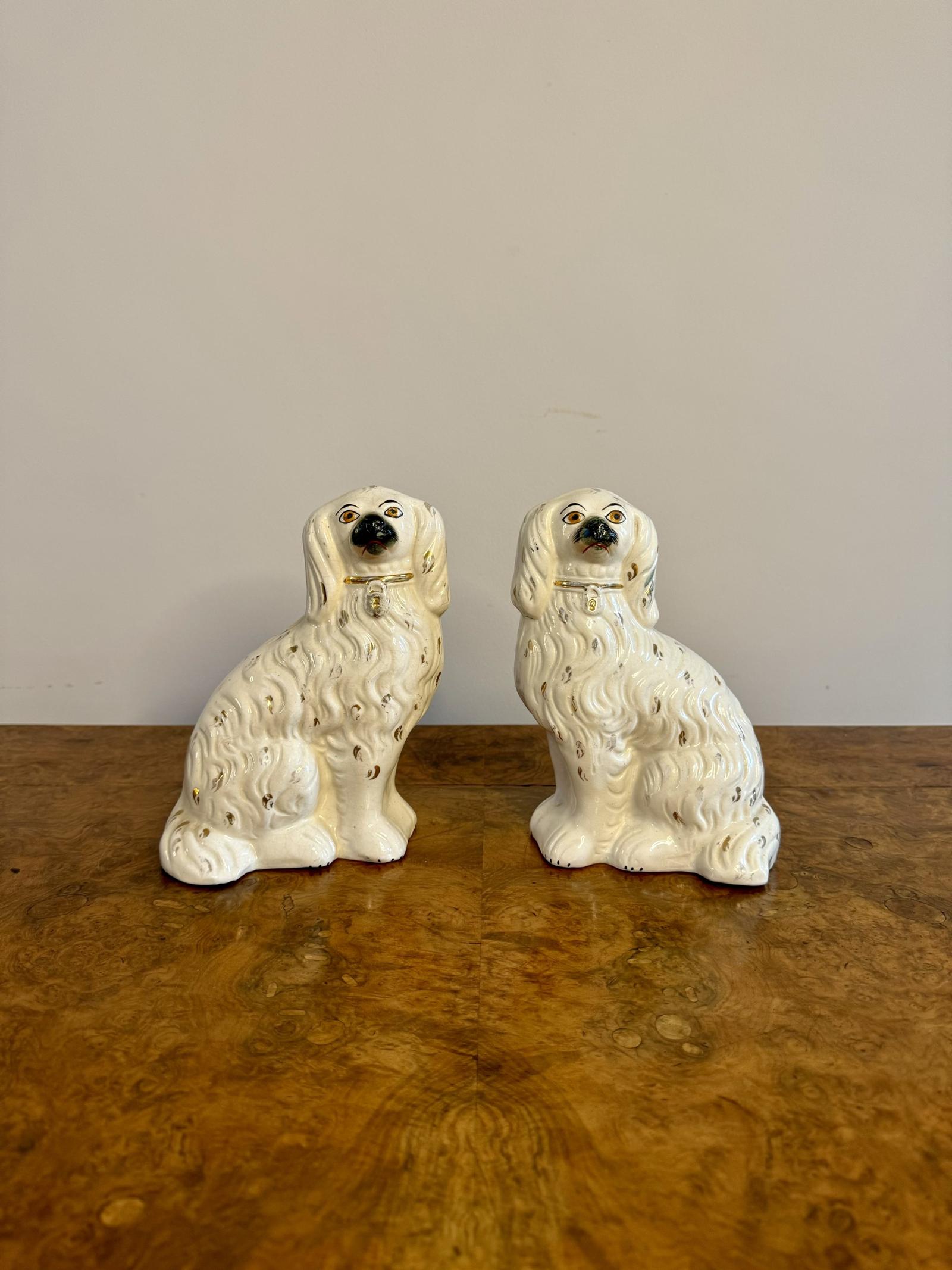 Pair of antique Victorian Staffordshire dogs, having a pair of seated spaniels in white and gold coloured coats with matching collars and padlocks.