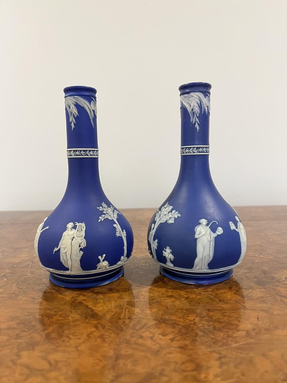 Pair of late 19th Century Victorian antique Wedgwood Jasper Ware vases having a quality pair of antique Victorian blue and white coloured bottle shaped Wedgwood Jasper Ware vases.