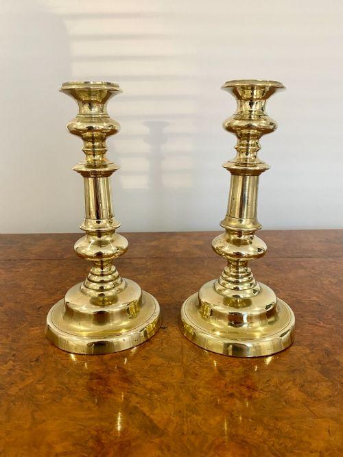 Pair of early 19th Century George Iii antique quality brass candlesticks having a quality turned column raised on a circular base