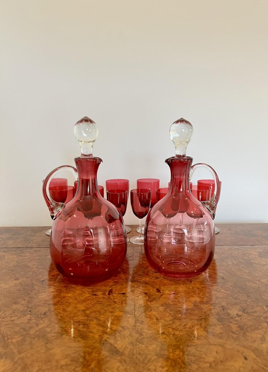 Pair of quality Antique Victorian Cranberry Glass Decanters with twelve cranberry glass wine glasses having a quality pair of antique Victorian cranberry glass decanters with a circular body and a shaped transparent glass handle to the back having the original glass stoppers, with twelve cranberry glass wine glasses of various sizes.