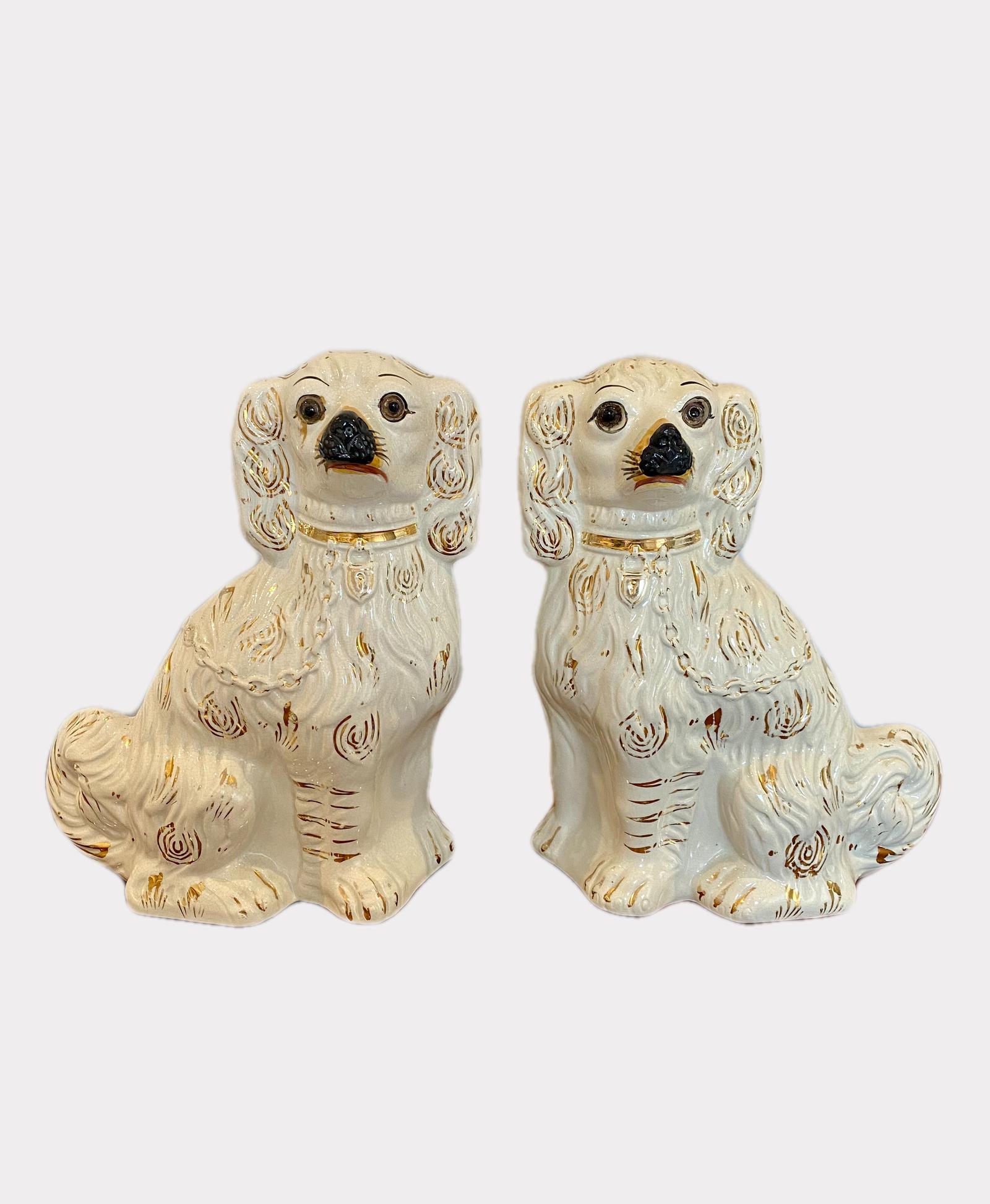 Pair of quality antique Victorian Staffordshire spaniel seated dog, having white and gold coloured matching coats with gold detail, collars and padlocks. Original glass eyes.