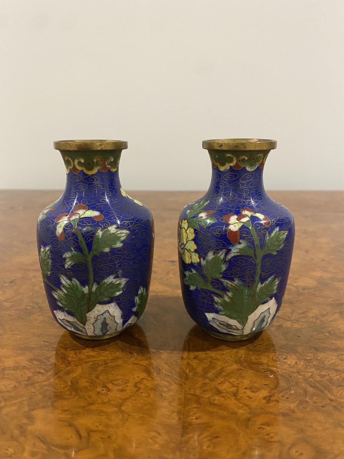 Pair of quality Japanese closionne vases having flower decoration in wonderful blue, green, red, yellow and white colours.