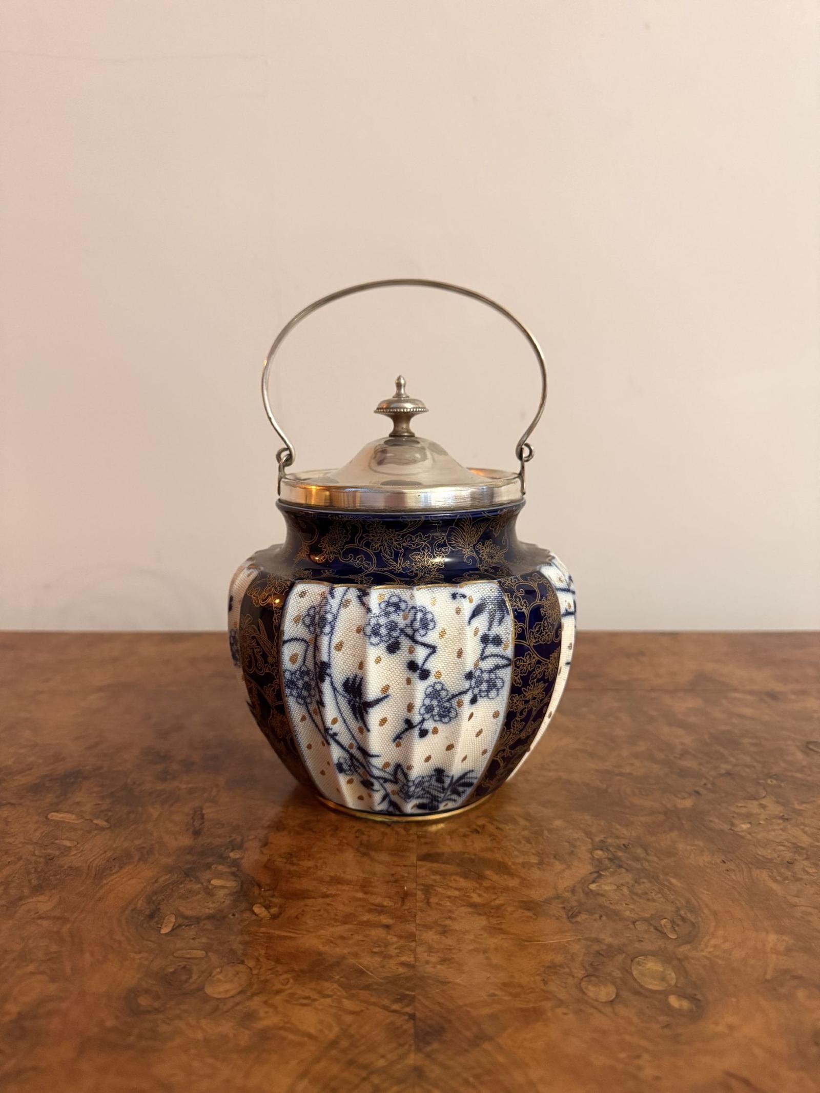 Pretty antique Doulton Burslem biscuit barrel, with a shaped body decorated with panels of floral detail in blue and white colours within borders of blue and gold gilded detail, having a silver plated removable lid and a shaped swing carrying handle to the top. In good condition, stamped to the base as shown.