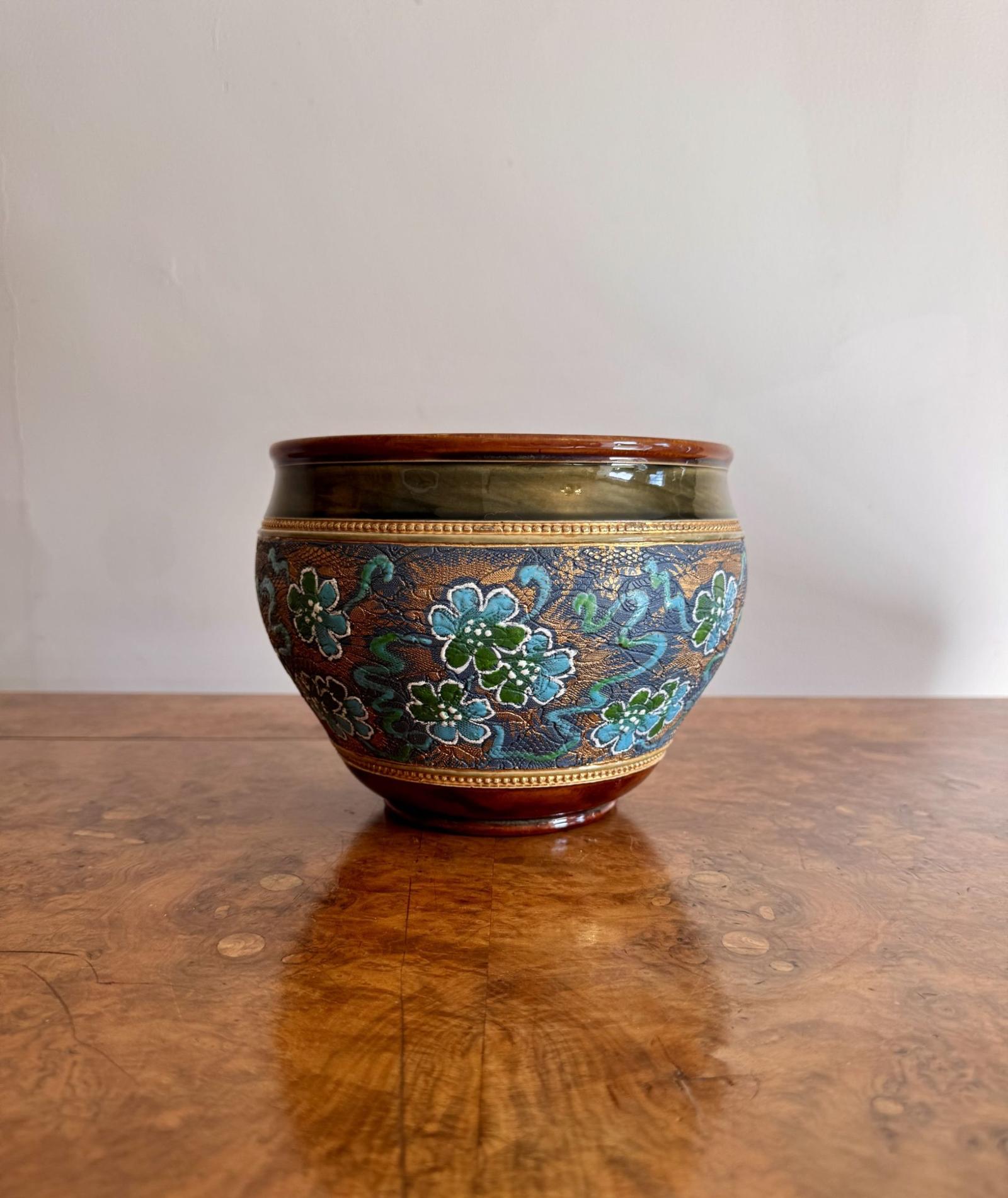 Pretty quality antique Royal Doulton jardiniere, having a quality antique Royal Doulton Jardiniere with a brown rim above a green and gold border, with a golden ground decorated with blue and green flowers, with a glazed finish, raised on a circular shaped base. Stamped to the base as shown.