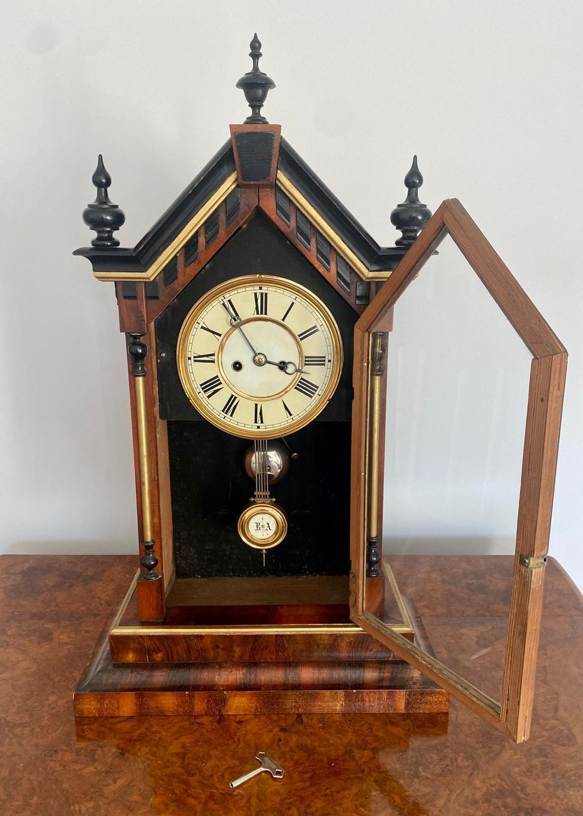 Quality 19th Century American mantel clock with black Roman numerals to the cream face, the 8-day movement striking on a bell; the mixed wood case with mouldings picked out in black and gilt, with finials to the pitched apex, glazed door and stepped plinth. With original key and pendulum.