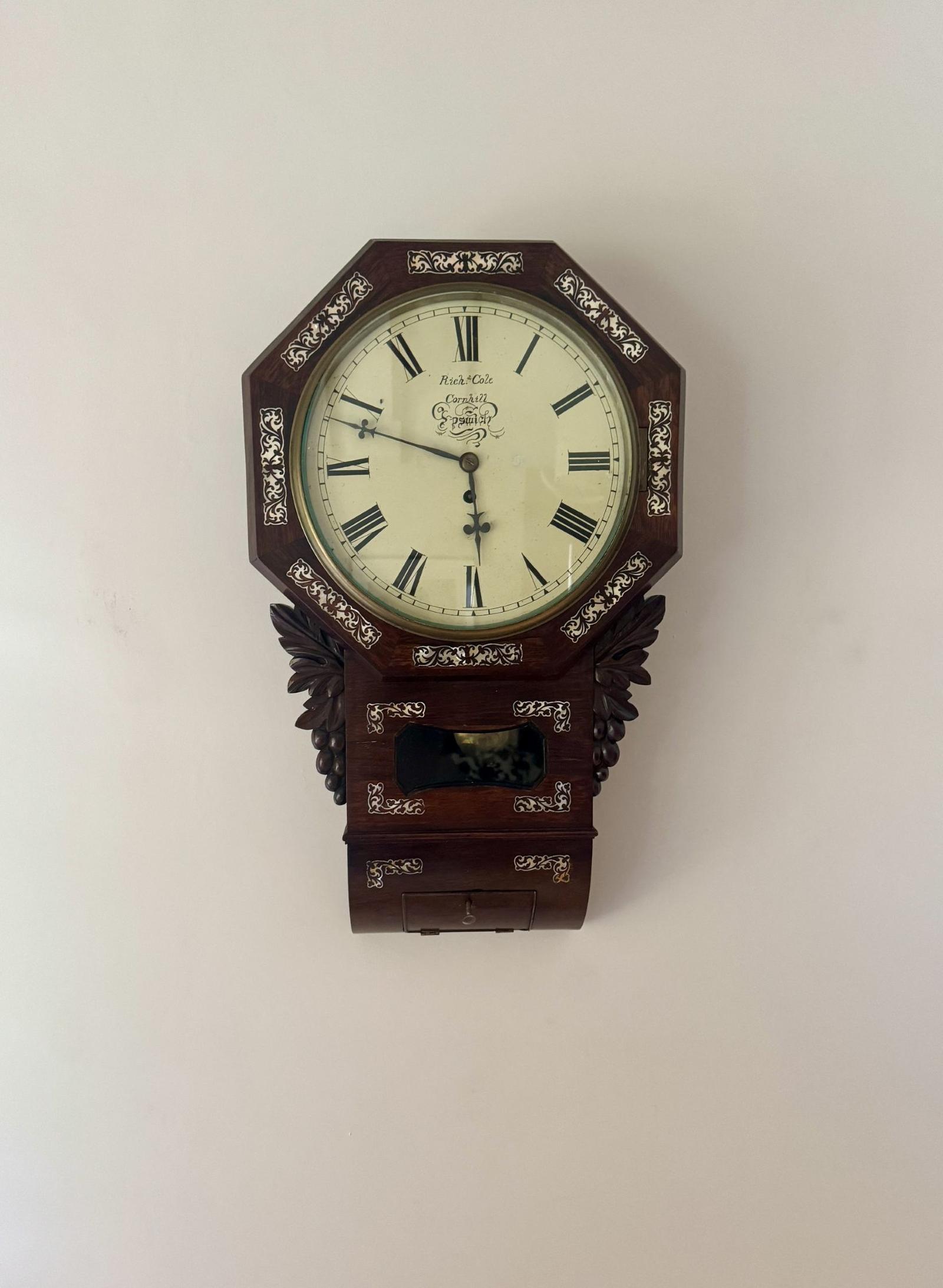 Quality antique 19th Century rosewood inlaid drop dial wall clock, having a quality antique Victorian rosewood mother of pearl inlaid wall clock, having a large 12 inch dial to the centre with black Roman numerals and black hands the dial inscribed Rich & Cole, Cornhill, Ipswich surrounded by a brass bezel, above a exposed drop dial within a glazed panel, having a quality eight day movement with the original winding key.