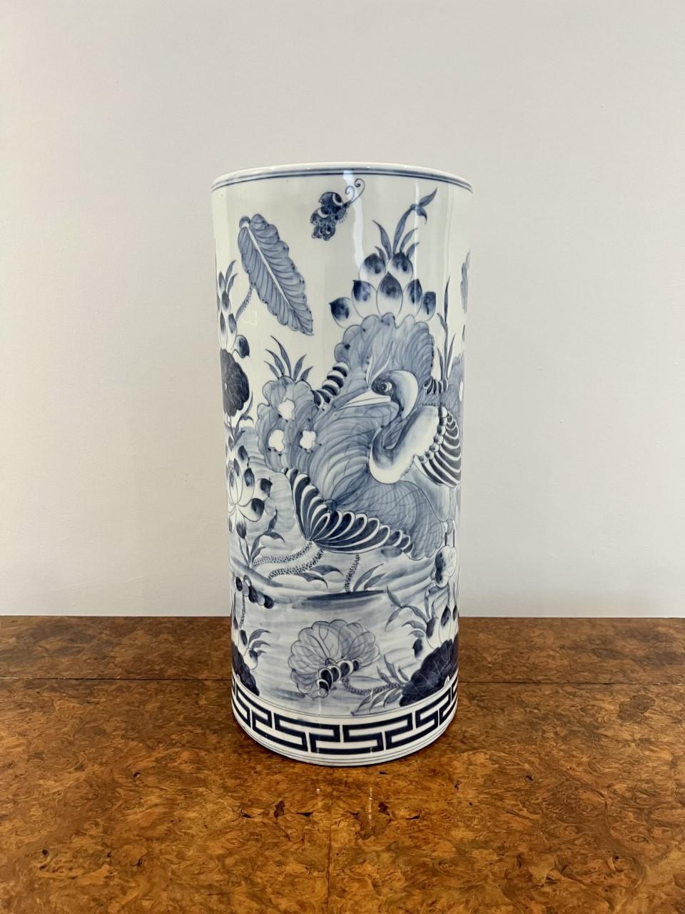Quality antique blue and white Chinese stick stand having a tall circular quality Chinese stick stand with wonderful decoration in blue and white colours.