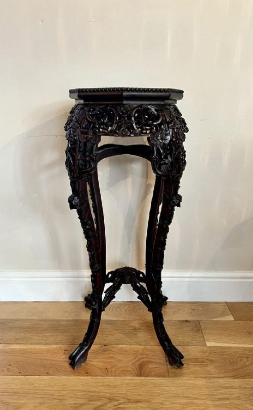 Quality antique carved hardwood Chinese stand having a marble top with a hardwood carved edge, outstanding quality carved frieze standing on shaped carved cabriole legs with scroll feet united by a carved stretcher.