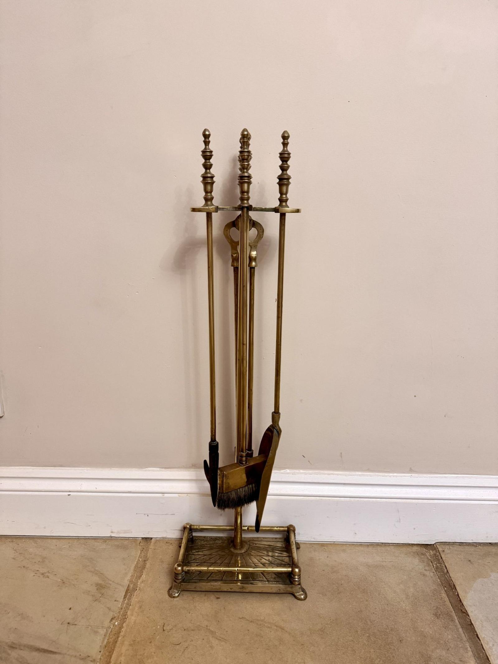 Quality antique Edwardian brass companion set and stand, with a pair of brass fire tongs, a brass shovel, a brass brush and a brass poker with shaped brass handles.
