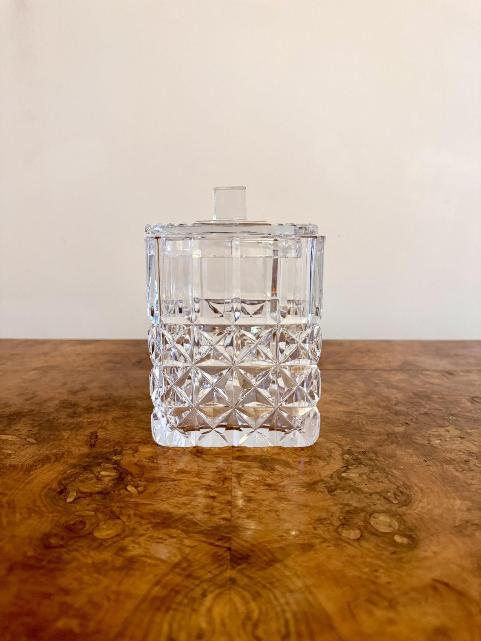 Quality antique Edwardian cut glass biscuit jar having a quality antique cut glass square shaped biscuit jar with the original cut glass lid.