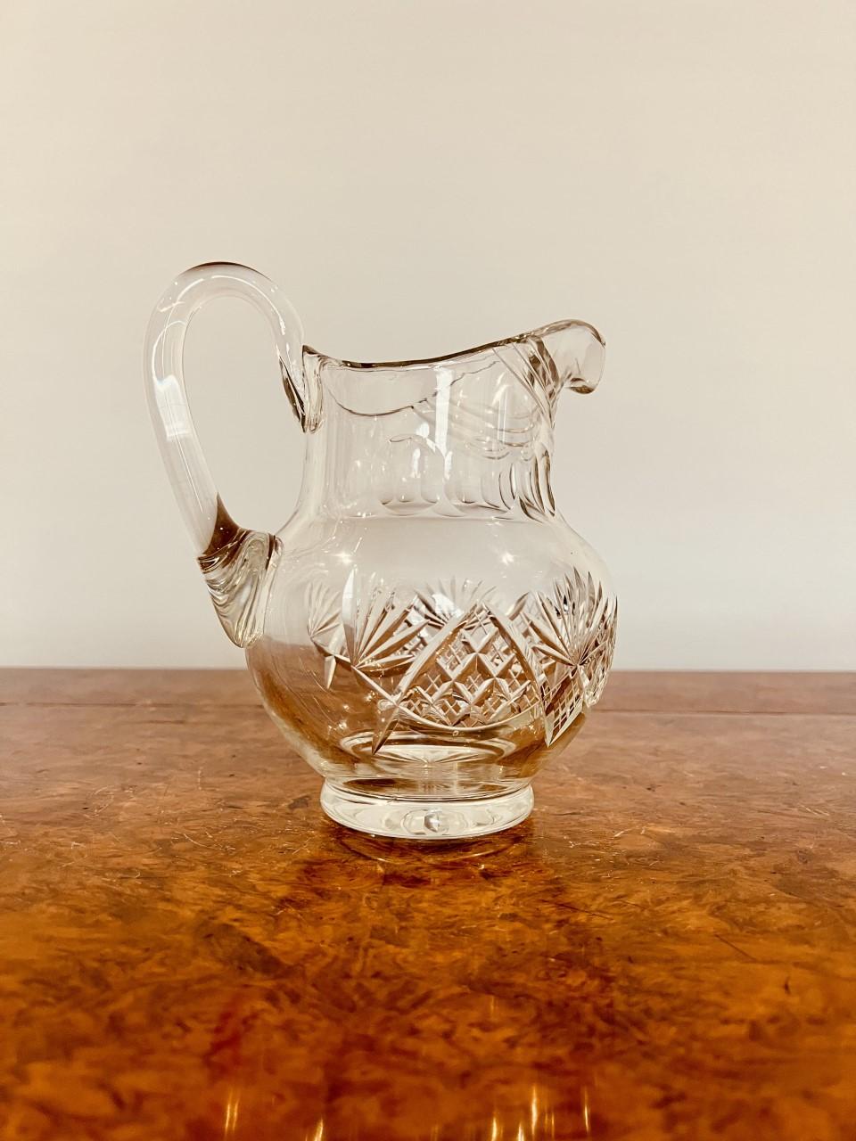 This is a quality Edwardian antique cut glass water jug having a quality cut glass water jug with a shaped handle.