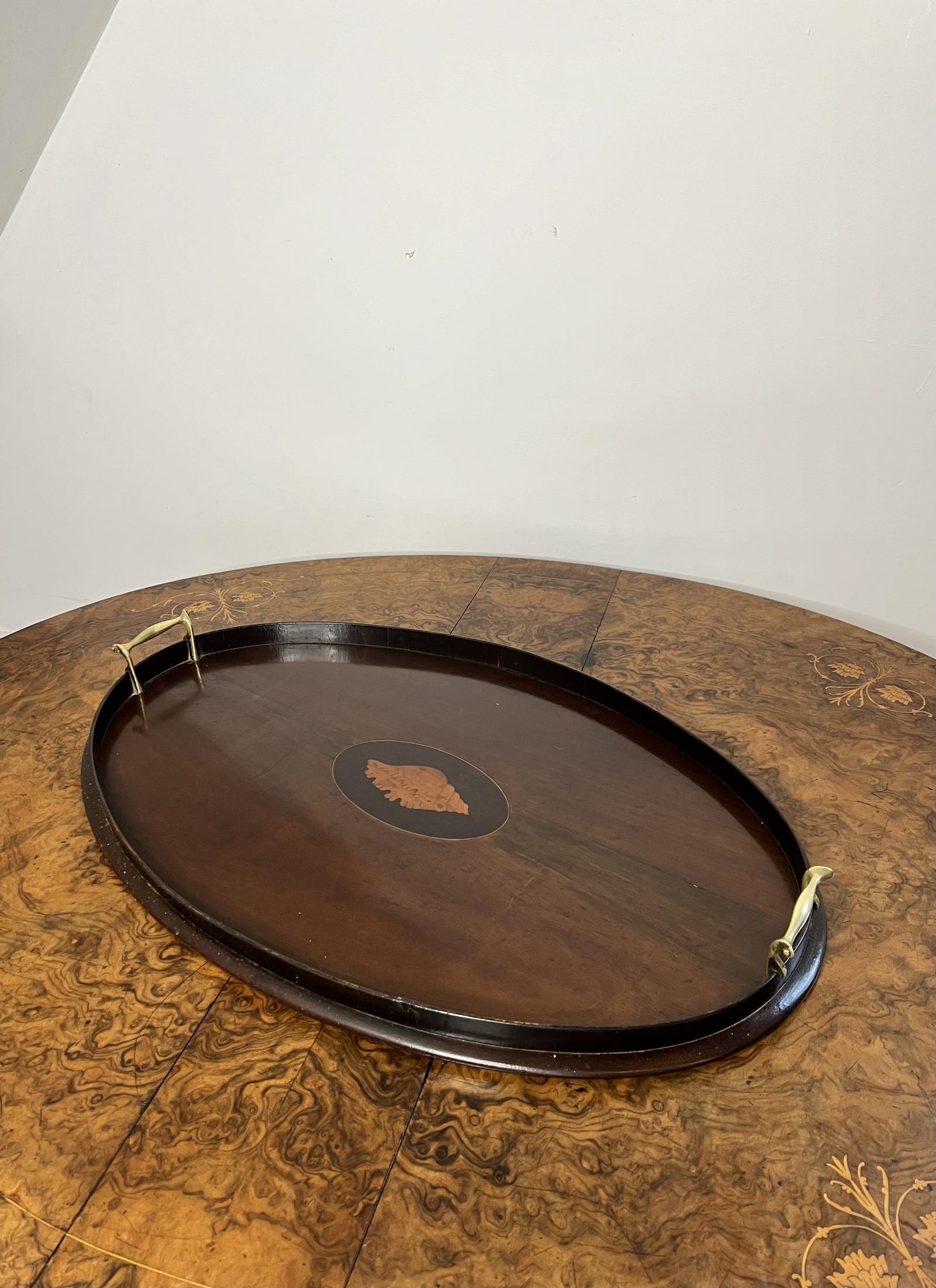 Quality antique Edwardian mahogany inlaid oval tea tray having a quality mahogany inlaid shell to the centre of the tray with a gallery edge and the original brass carrying handles